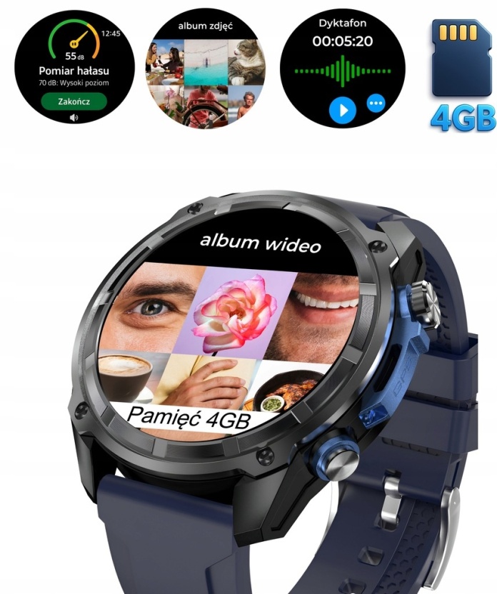 Poznaj nowoczesny smartwatch, który łączy elegancki wygląd z ogromnymi możliwościami. Wyposażony w ekran AMOLED o żywych kolorach, wbudowany GPS i funkcję nagrywania audio i wideo, stanie się Twoim osobistym asystentem w każdej sytuacji. Dzięki mocnej baterii 860 mAh, latarce i pamięci 4 GB, możesz korzystać z niego bez ograniczeń – w pracy, na treningu czy w podróży.
